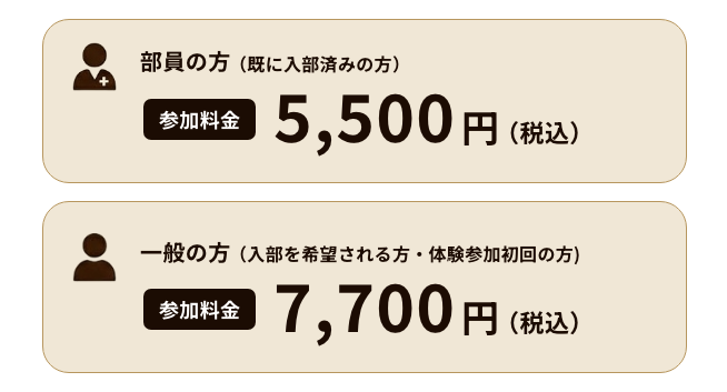・一般参加料金にはお得な入部費用が含まれています。事務局より入部登録のご案内がございます。