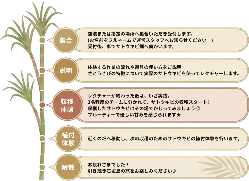 当日は、サトウキビや農産物についてはもちろん、石垣島の生態系まで知り尽くした“情報量豊富”な農家さんが丁寧に解説いたします。サトウキビの魅力をより深く理解し、体験できます。