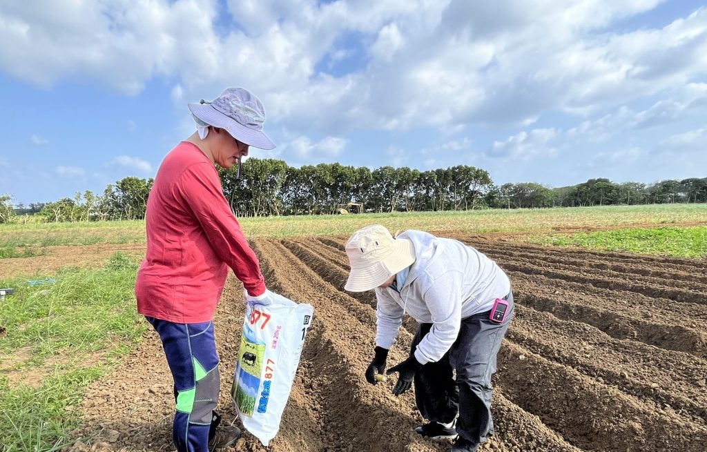 苗を置いたあとは、肥料をまきます。その後土を被せ、上から踏んで馴らして完了です。