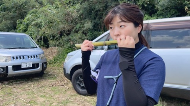 刈り取ったサトウキビを味わいました。サトウキビの皮を削って少しかじると、優しい甘さが口に広がります!