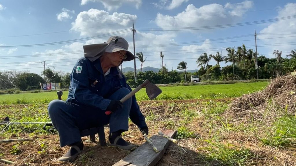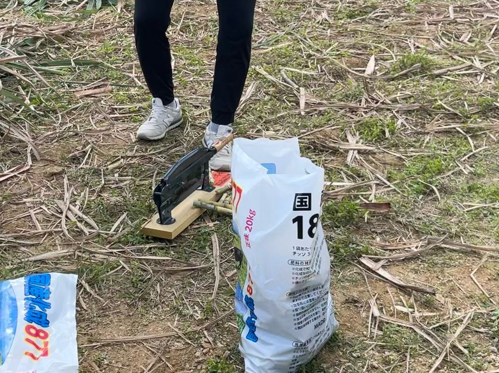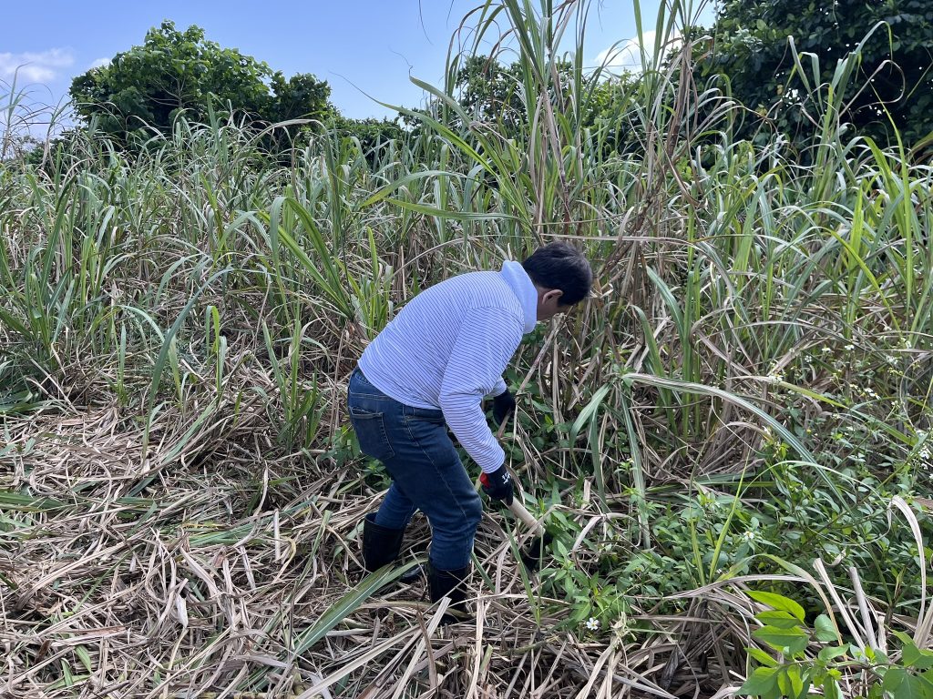 松原さんのお父様が、サトウキビをオノで切って苗の補充をしてくださいました。