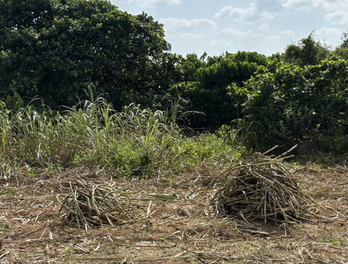 刈り取ったサトウキビは葉の部分を更にカマで切り落とし、棒状になったものを一か所にまとめていきます。何本かまとめて運ぶと、結構な重量になります。いいトレーニングです。