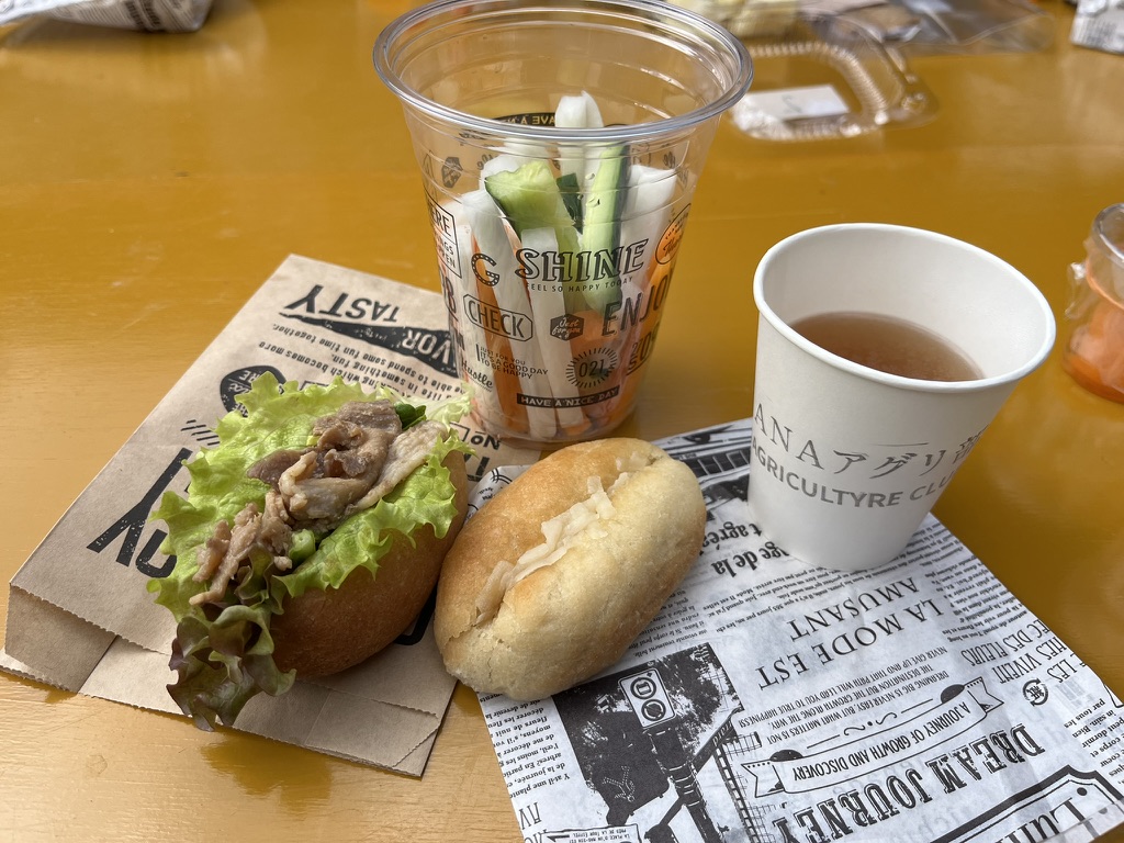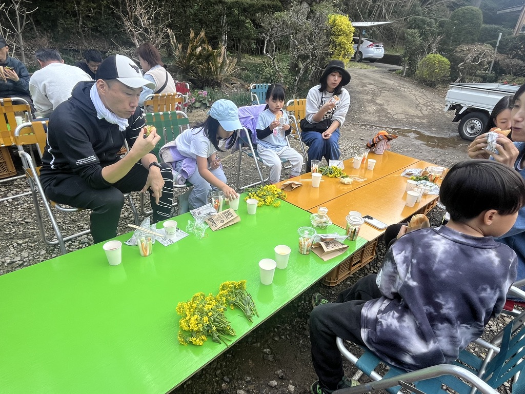 体験後は、畑で菜の花を摘み、ランチタイムへ。たちばなふぁーむさんのシェアキッチンで用意されたのは、米粉のパンサンド、新鮮な野菜スティックと味噌ディップ、そしてホクホクのじゃがいも。どれもシンプルながら、素材の味がしっかりと感じられるものばかりでした。