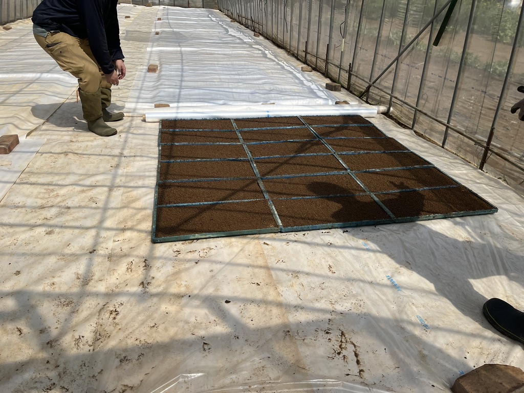 土をかけて、しっかり水分をまとった育苗箱を、大事に隣のビニールハウスに入れると、今日の任務は完了。